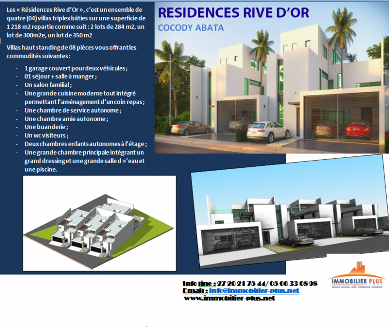 Les Résidences Rive D'or, C'est un ensemble de quatre (04) villas triplex bâties sur une superficie de 1218 m2 repartie comme suit : 2 lots de 284 m2, un lot de 300 m2, un lot de 350 m2 villa Haut standing de 08 pièces vous offrant les commodités suivantes : - 1 garage couvert pour deux véhicules ; - 01 séjour + salle à manger ; - Un salon familial ; - Une grande cuisine moderne tout intégré permettant l'aménagement d'un coin repas ; - Une chambre de service autonome ; - Une chambre amie autonome ; - Une buanderie ; - Un WC visiteurs ; - Deux chambres enfants autonomes à l'étage ; - Une grande chambre principale intégrant un grand dressing et une grande salle d'eau et une piscine -- CONTACTS: 27 20 21 75 44 // 05 06 33 08 98 // 05 75 08 98 8